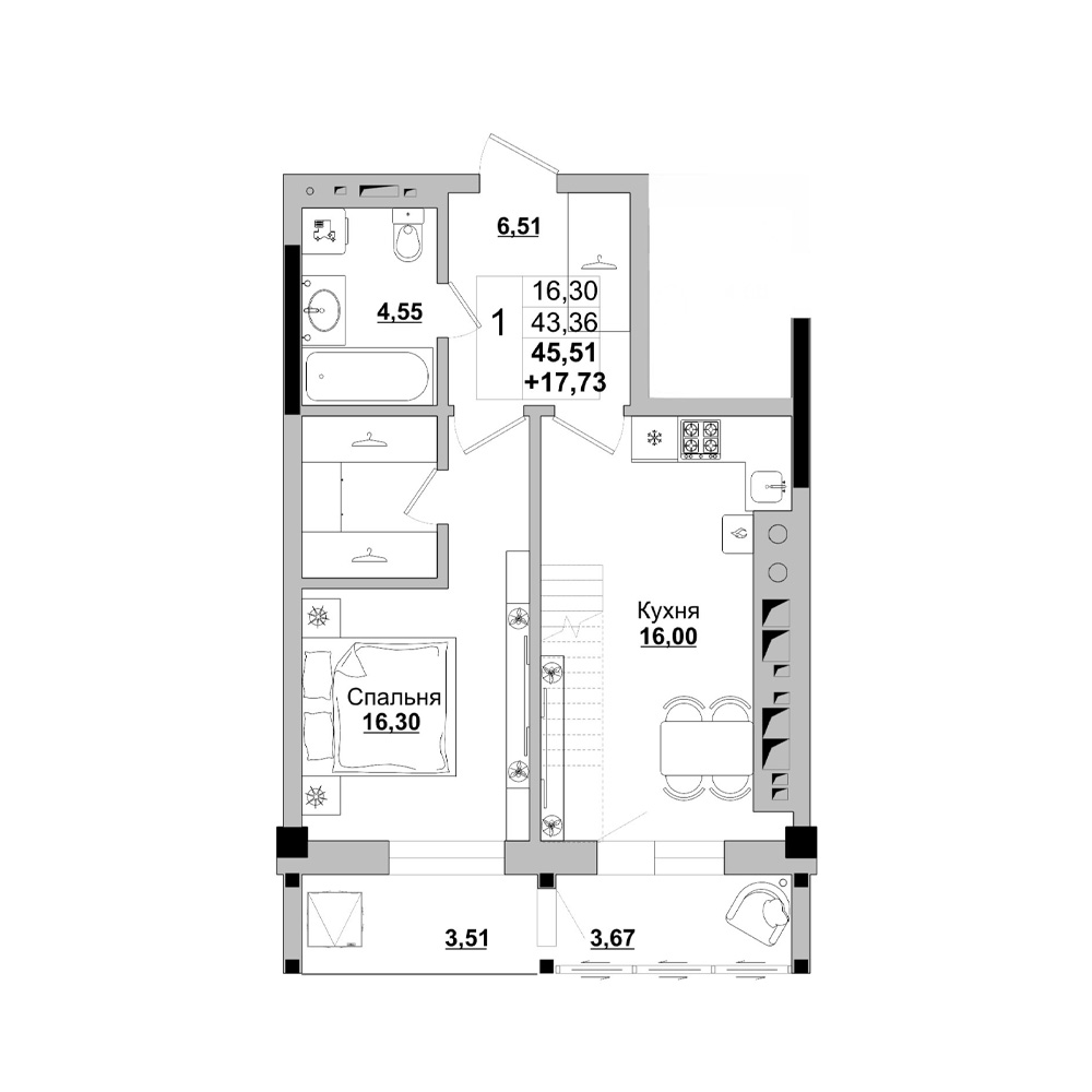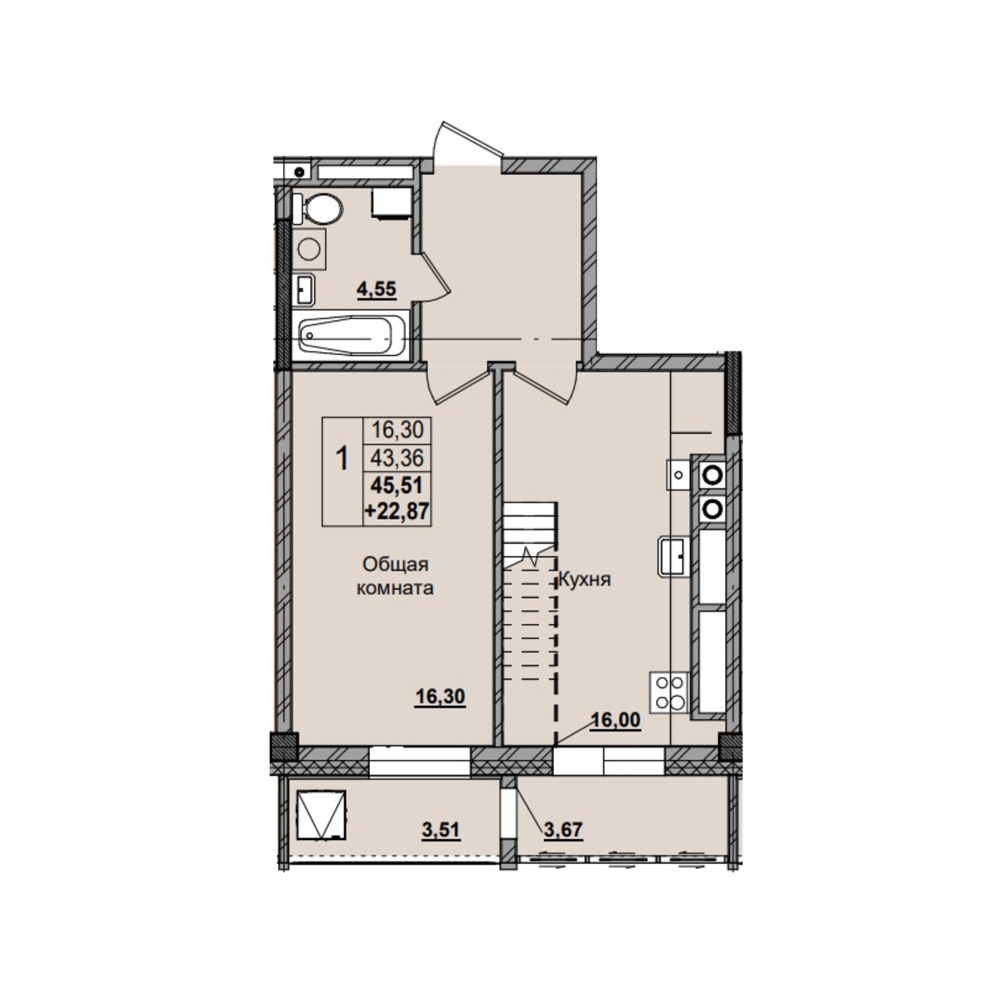 1-комн. 61,7 м² ・ № 163 ・ этаж 16/16 ・ ЖК Зеркальный лес 1 этап