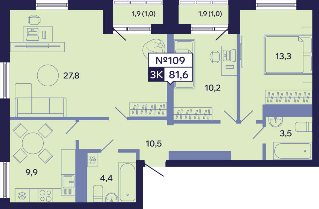 3-комн. 81,60 м² ・ № 109 ・ этаж 11/16 ・ ЖК "Ленские высоты", корп. 9