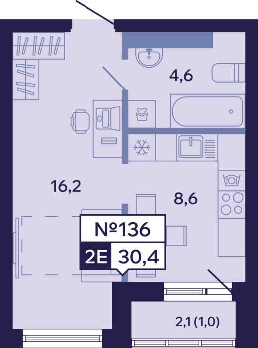 1-комн. 30,40 м² ・ № 136 ・ этаж 14/16 ・ ЖК "Ленские высоты", корп. 9