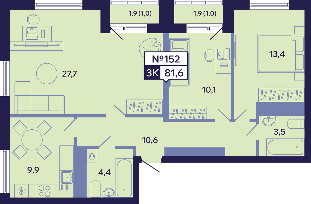 3-комн. 81,60 м² ・ № 152 ・ этаж 15/16 ・ ЖК "Ленские высоты", корп. 9