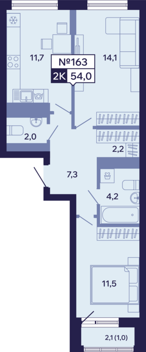 2-комн. 54,00 м² ・ № 163 ・ этаж 3/16 ・ ЖК "Ленские высоты", корп. 9