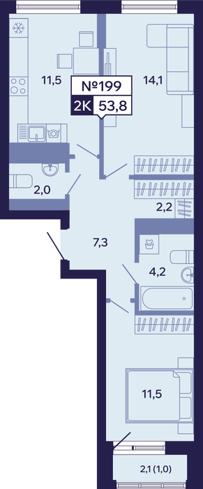 2-комн. 53,80 м² ・ № 199 ・ этаж 12/16 ・ ЖК "Ленские высоты", корп. 9