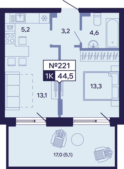 2-комн. 44,50 м² ・ № 221 ・ этаж 2/16 ・ ЖК "Ленские высоты", корп. 9