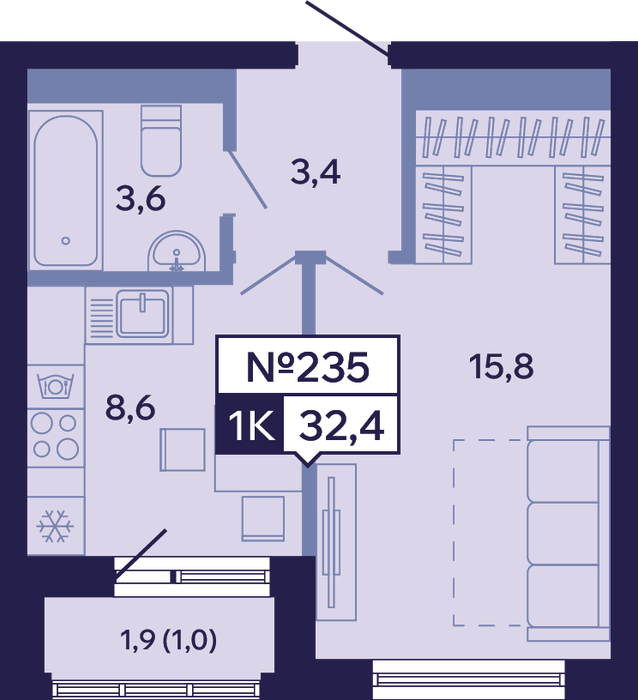 1-комн. 32,40 м² ・ № 235 ・ этаж 6/16 ・ ЖК "Ленские высоты", корп. 9