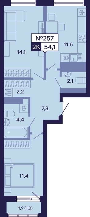 2-комн. 53,80 м² ・ № 257 ・ этаж 11/16 ・ ЖК "Ленские высоты", корп. 9