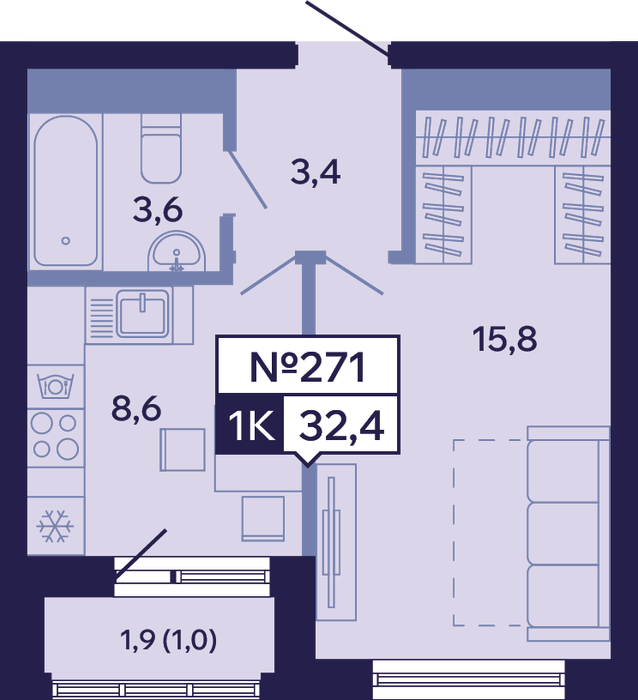 1-комн. 32,20 м² ・ № 271 ・ этаж 15/16 ・ ЖК "Ленские высоты", корп. 9