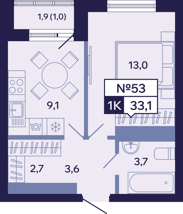 1-комн. 33,10 м² ・ № 53 ・ этаж 6/16 ・ ЖК "Ленские высоты", корп. 9