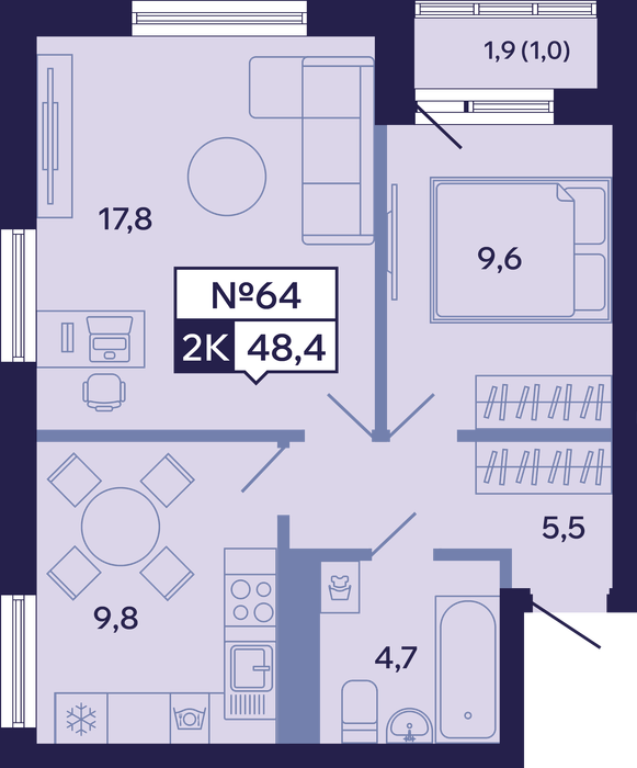2-комн. 48,40 м² ・ № 64 ・ этаж 7/16 ・ ЖК "Ленские высоты", корп. 9