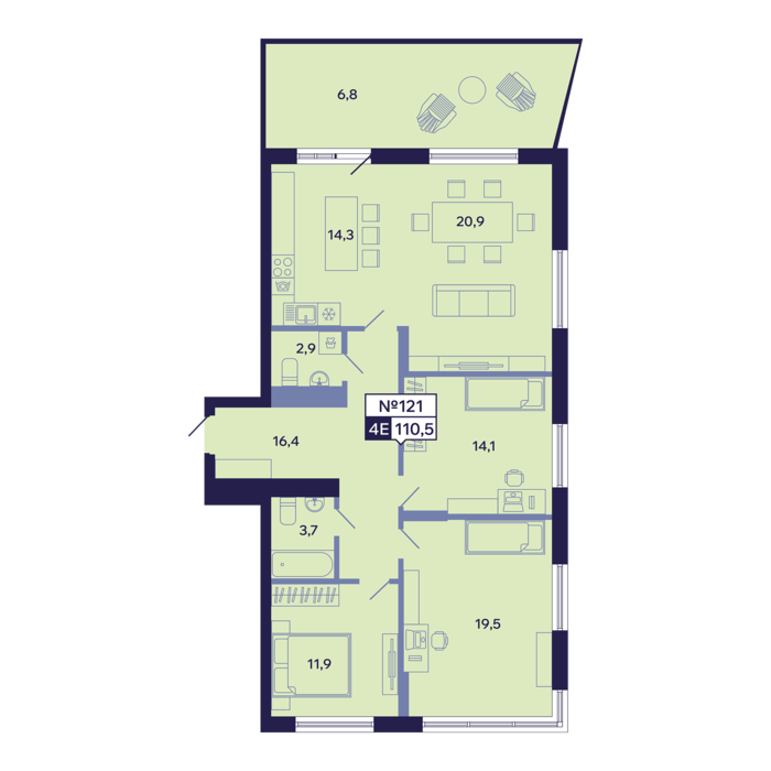 4-комн. 110,50 м² ・ № 121 ・ этаж 2/13 ・ ЖК "Ленские высоты", корп. 1