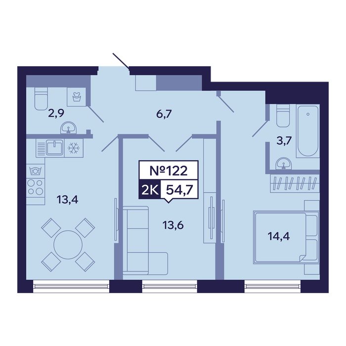 2-комн. 54,70 м² ・ № 122 ・ этаж 2/13 ・ ЖК "Ленские высоты", корп. 1