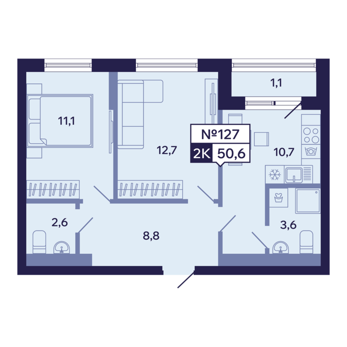 2-комн. 50,60 м² ・ № 127 ・ этаж 3/13 ・ ЖК "Ленские высоты", корп. 1
