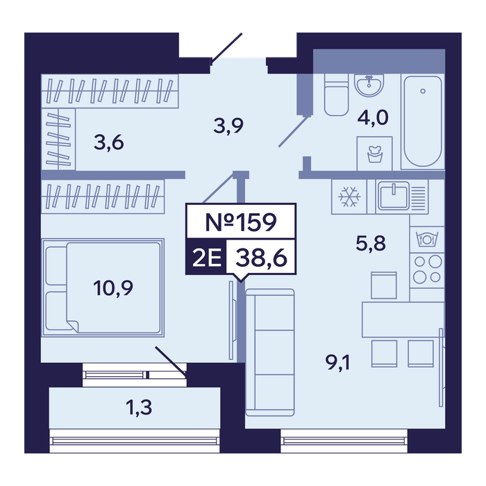 2-комн. 38,60 м² ・ № 159 ・ этаж 7/13 ・ ЖК "Ленские высоты", корп. 1