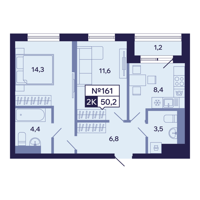 2-комн. 50,20 м² ・ № 161 ・ этаж 7/13 ・ ЖК "Ленские высоты", корп. 1