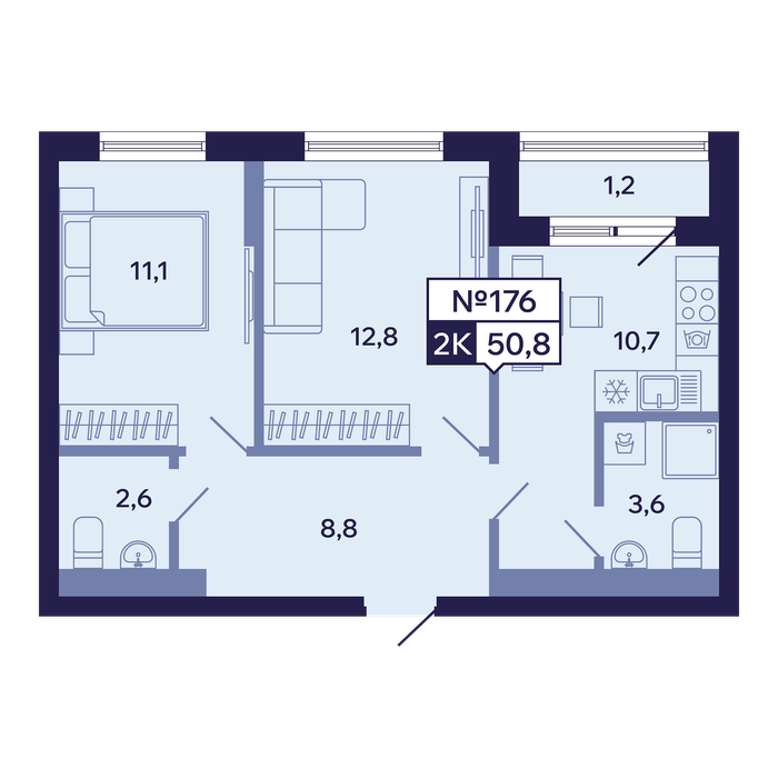 2-комн. 50,80 м² ・ № 176 ・ этаж 10/13 ・ ЖК "Ленские высоты", корп. 1