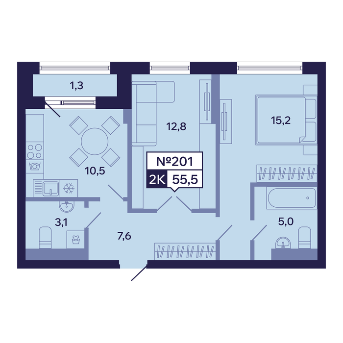 2-комн. 55,50 м² ・ № 201 ・ этаж 3/13 ・ ЖК "Ленские высоты", корп. 1