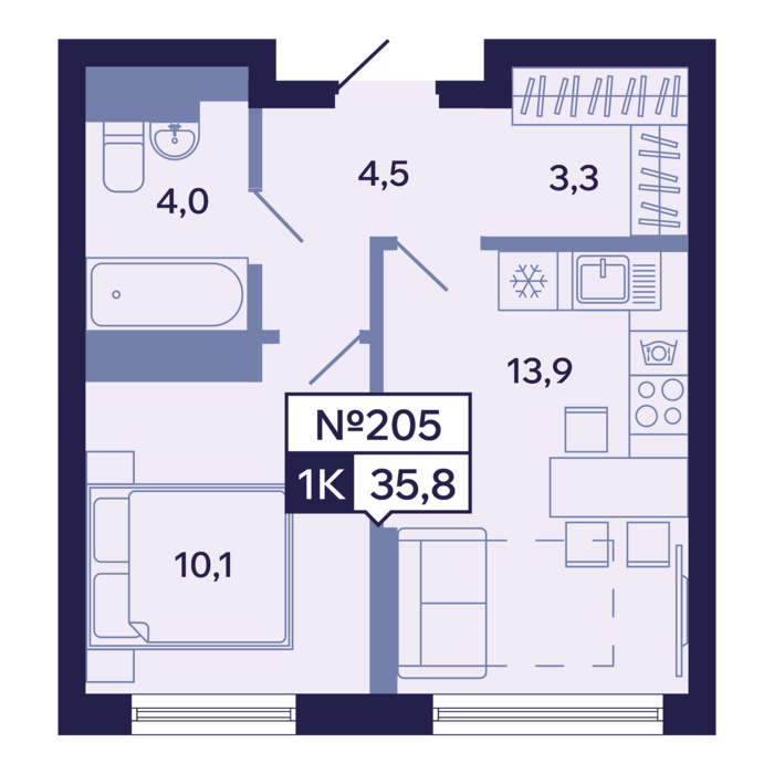 1-комн. 35,80 м² ・ № 205 ・ этаж 3/13 ・ ЖК "Ленские высоты", корп. 1