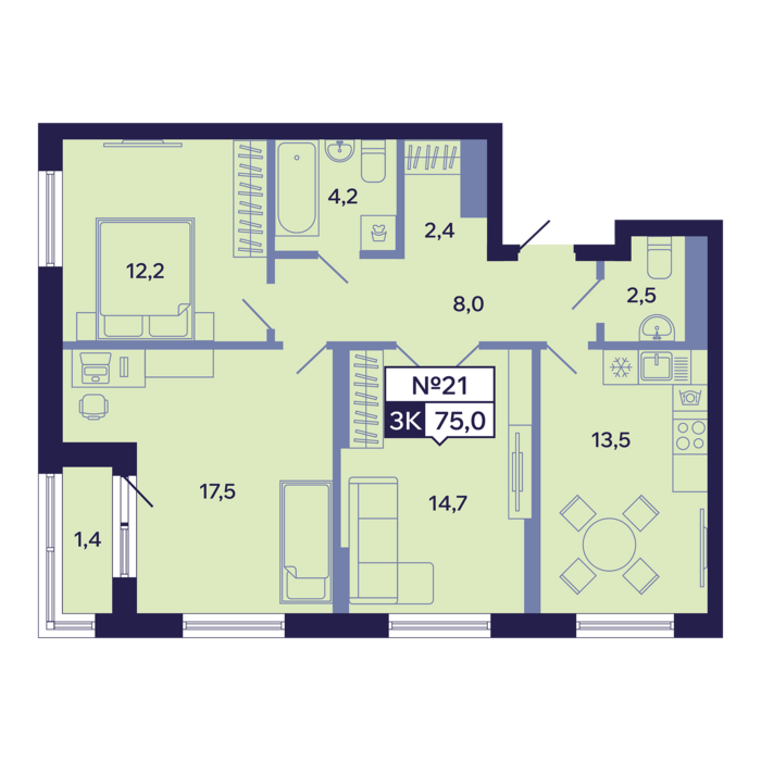 3-комн. 76,40 м² ・ № 21 ・ этаж 4/16 ・ ЖК "Ленские высоты", корп. 1