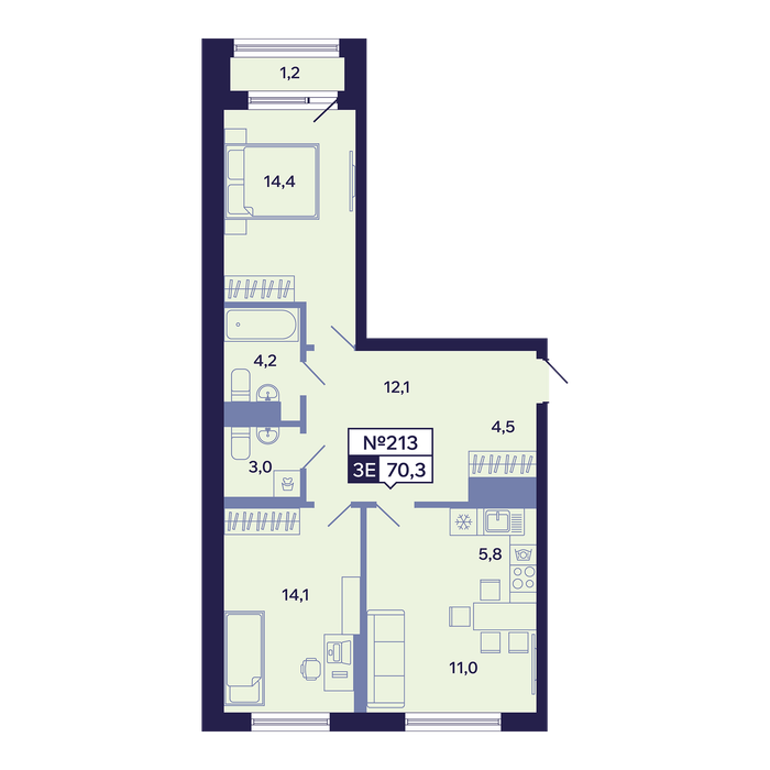 3-комн. 70,30 м² ・ № 213 ・ этаж 4/13 ・ ЖК "Ленские высоты", корп. 1