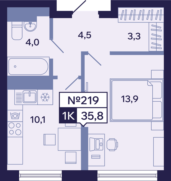 1-комн. 35,80 м² ・ № 219 ・ этаж 5/13 ・ ЖК "Ленские высоты", корп. 1