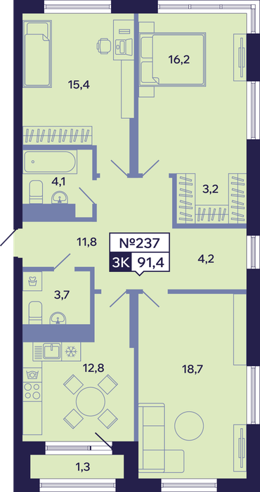 3-комн. 91,40 м² ・ № 237 ・ этаж 8/13 ・ ЖК "Ленские высоты", корп. 1