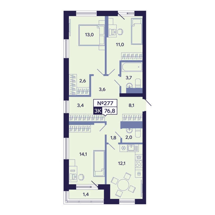 3-комн. 76,80 м² ・ № 277 ・ этаж 3/16 ・ ЖК "Ленские высоты", корп. 1