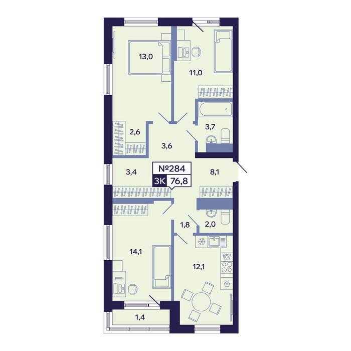 3-комн. 76,80 м² ・ № 284 ・ этаж 4/16 ・ ЖК "Ленские высоты", корп. 1