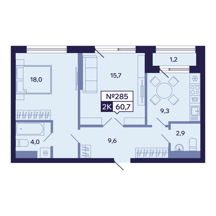 2-комн. 60,70 м² ・ № 285 ・ этаж 4/16 ・ ЖК "Ленские высоты", корп. 1