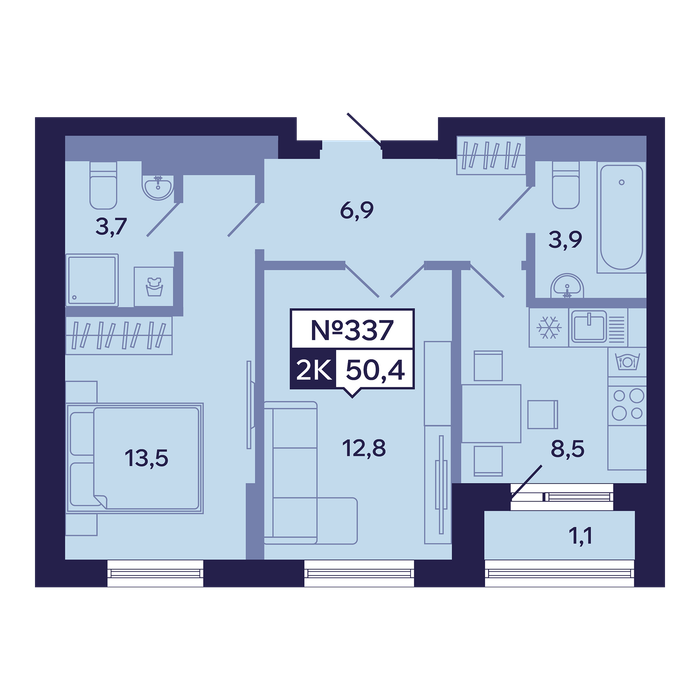 2-комн. 50,40 м² ・ № 337 ・ этаж 12/16 ・ ЖК "Ленские высоты", корп. 1