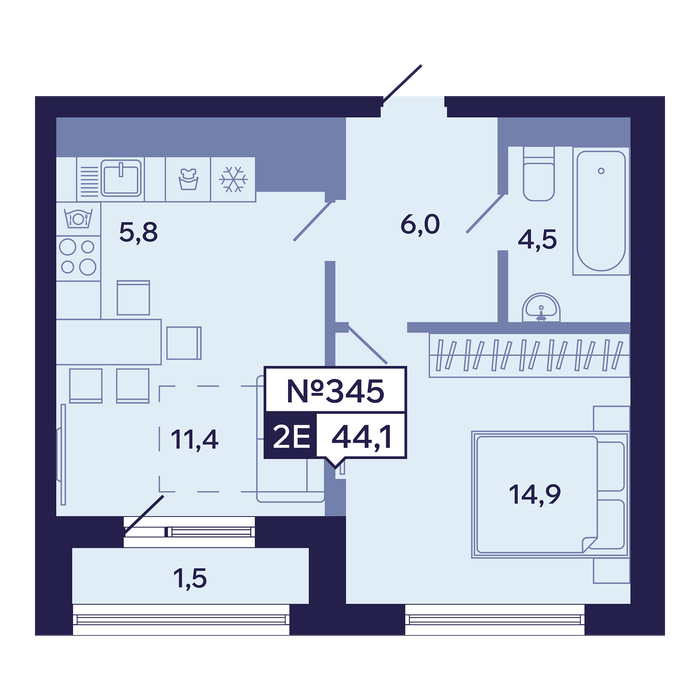 2-комн. 44,10 м² ・ № 345 ・ этаж 13/16 ・ ЖК "Ленские высоты", корп. 1
