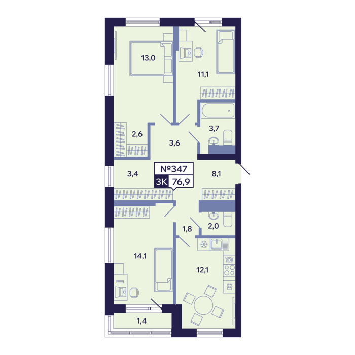 3-комн. 76,90 м² ・ № 347 ・ этаж 13/16 ・ ЖК "Ленские высоты", корп. 1