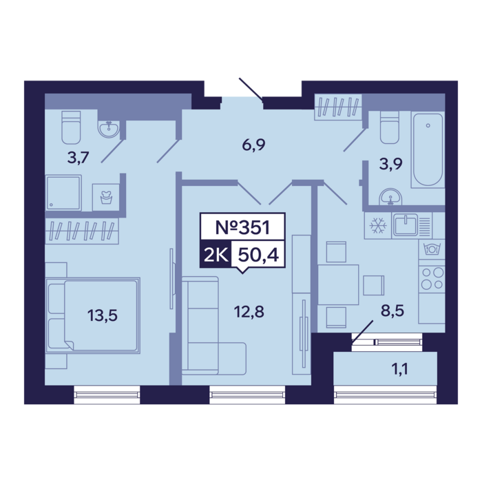 2-комн. 50,40 м² ・ № 351 ・ этаж 14/16 ・ ЖК "Ленские высоты", корп. 1