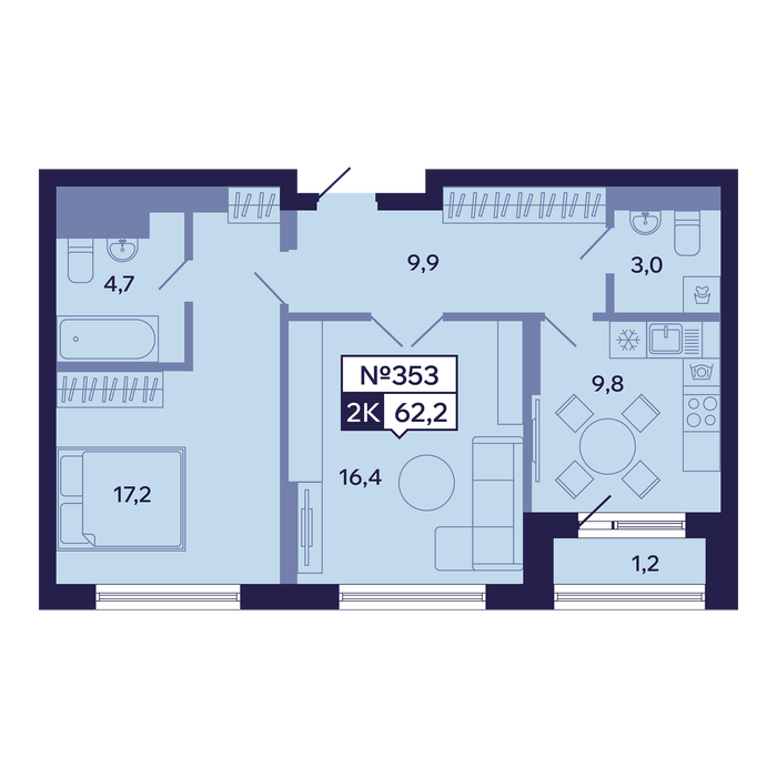 2-комн. 62,20 м² ・ № 353 ・ этаж 14/16 ・ ЖК "Ленские высоты", корп. 1