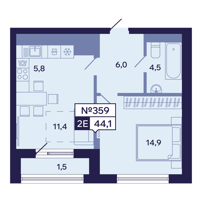 2-комн. 44,10 м² ・ № 359 ・ этаж 15/16 ・ ЖК "Ленские высоты", корп. 1