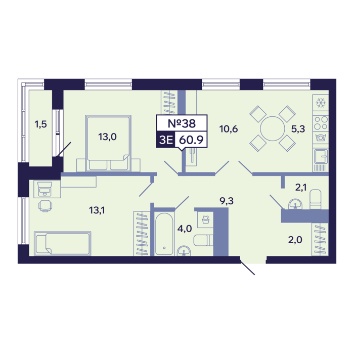 3-комн. 60,90 м² ・ № 38 ・ этаж 6/16 ・ ЖК "Ленские высоты", корп. 1