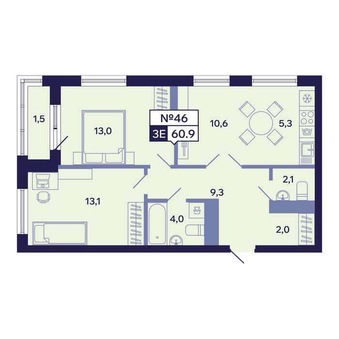 3-комн. 60,90 м² ・ № 46 ・ этаж 7/16 ・ ЖК "Ленские высоты", корп. 1
