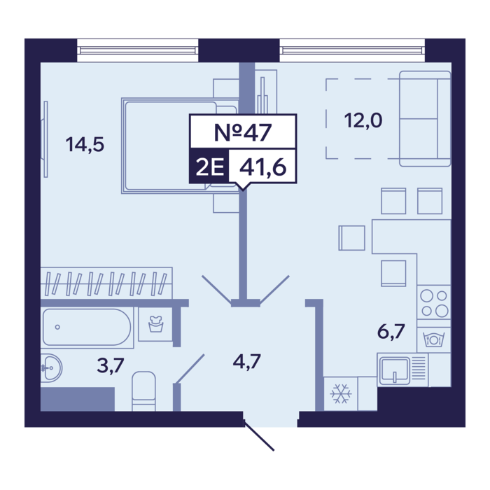 2-комн. 41,60 м² ・ № 47 ・ этаж 7/16 ・ ЖК "Ленские высоты", корп. 1