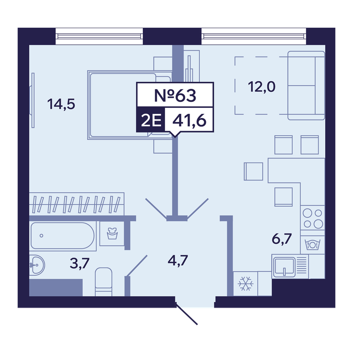 2-комн. 41,60 м² ・ № 63 ・ этаж 9/16 ・ ЖК "Ленские высоты", корп. 1