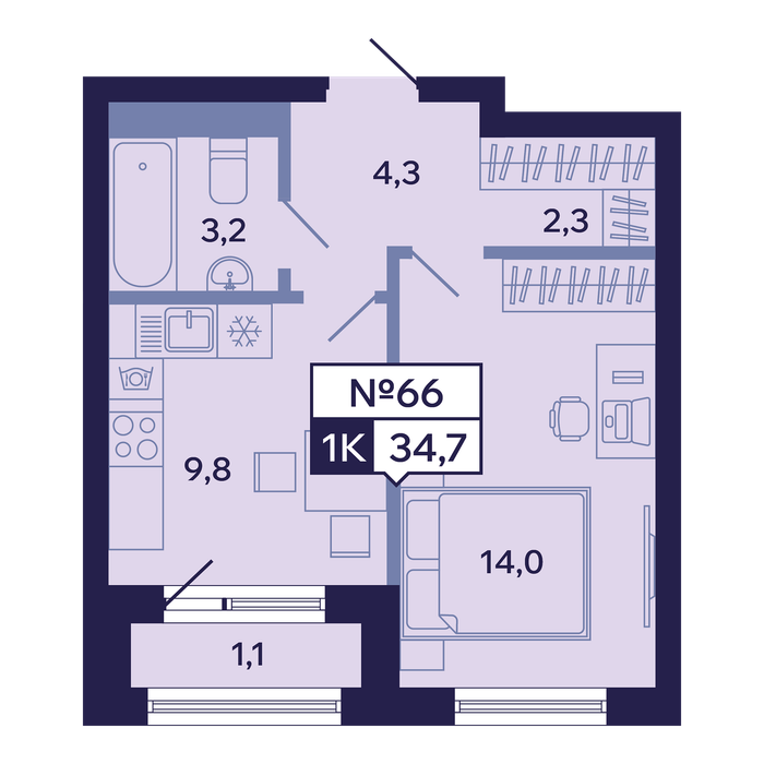 1-комн. 34,70 м² ・ № 66 ・ этаж 10/16 ・ ЖК "Ленские высоты", корп. 1