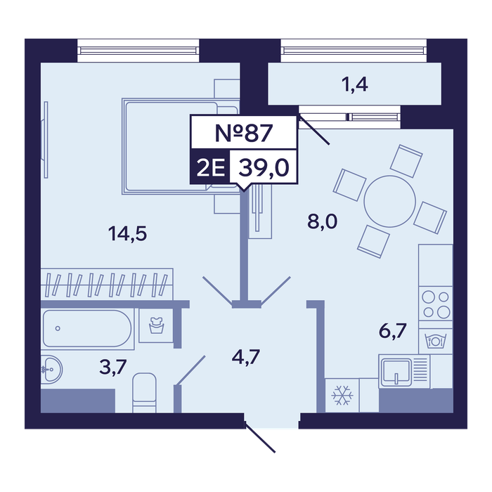 2-комн. 39,00 м² ・ № 87 ・ этаж 12/16 ・ ЖК "Ленские высоты", корп. 1