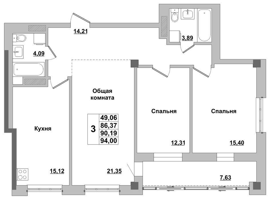 3-комн. 90,19 м² ・ № 328 ・ этаж 15/16 ・ ЖК Алгыс 3 этап