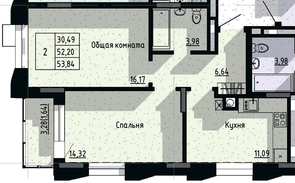 2-комн. 53,84 м² ・ № 21 ・ этаж 4/16 ・ ЖК Сосновый бор