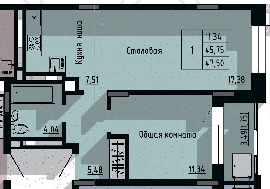 1-комн. 47,5 м² ・ № 38 ・ этаж 7/16 ・ ЖК Сосновый бор