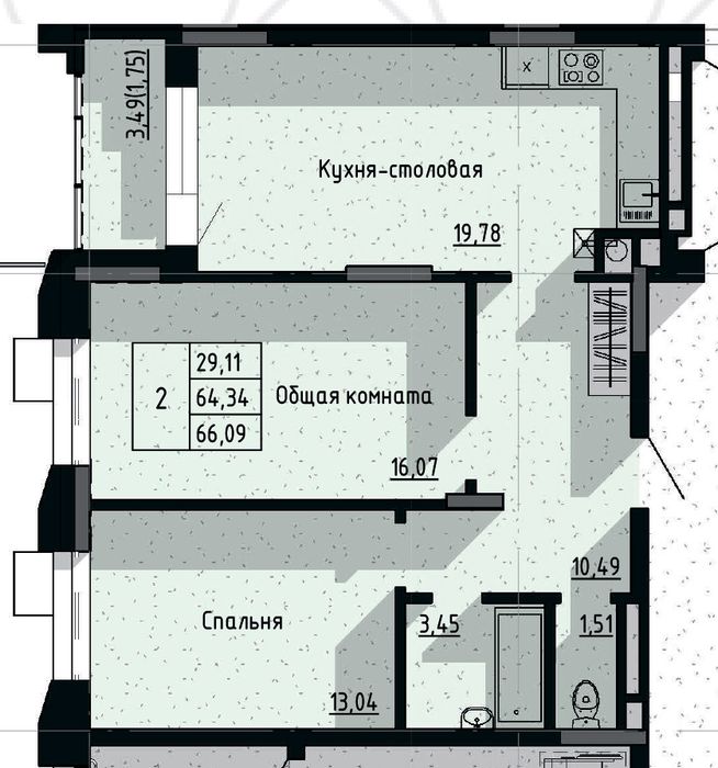 2-комн. 66,09 м² ・ № 4 ・ этаж 2/16 ・ ЖК Сосновый бор