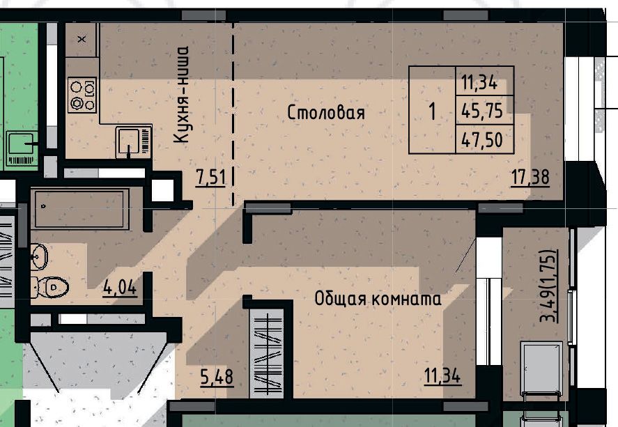 1-комн. 47,5 м² ・ № 66 ・ этаж 11/16 ・ ЖК Сосновый бор