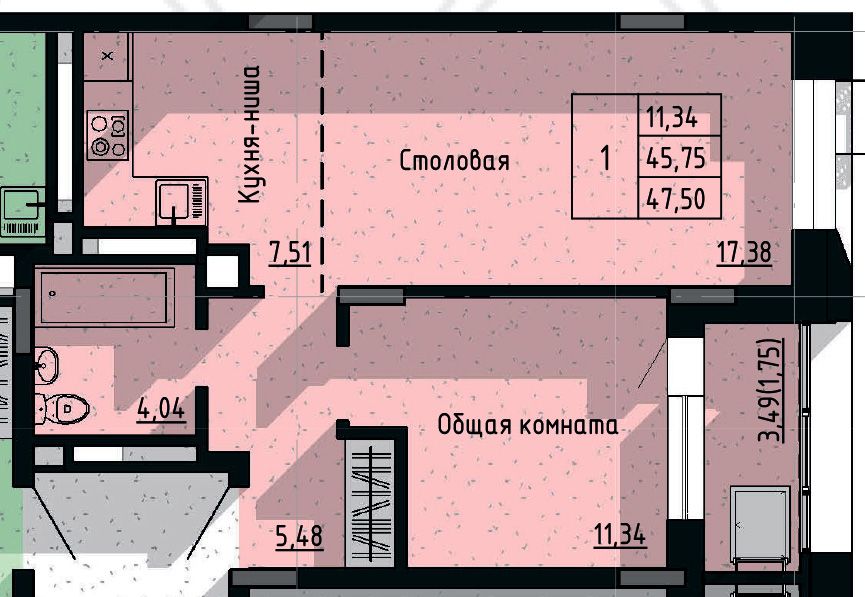 1-комн. 47,5 м² ・ № 87 ・ этаж 14/16 ・ ЖК Сосновый бор