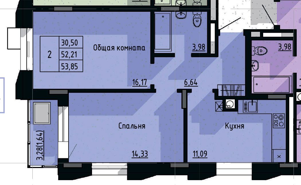 2-комн. 53,85 м² ・ № 98 ・ этаж 15/16 ・ ЖК Сосновый бор