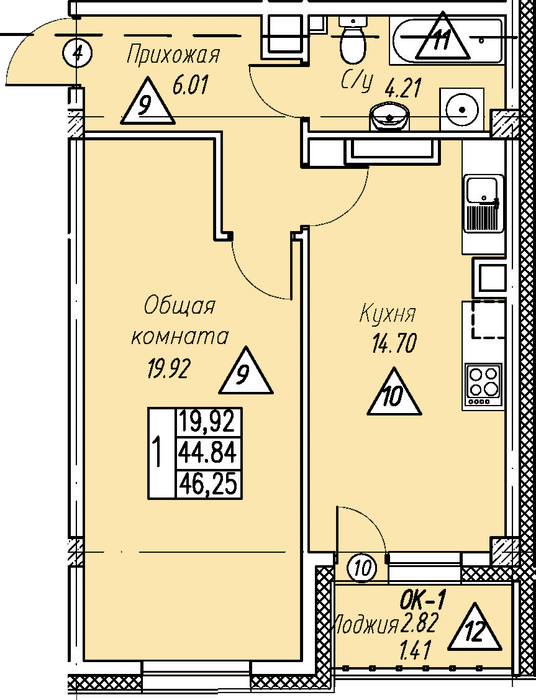 1-комн. 46,25 м² ・ № 101 ・ этаж 6/7 ・ ЖК Парк Победы, д. 1, этап 1