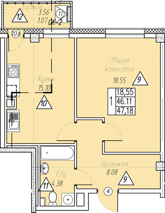 1-комн. 47,18 м² ・ № 20 ・ этаж 3/7 ・ ЖК Парк Победы, д. 1, этап 1