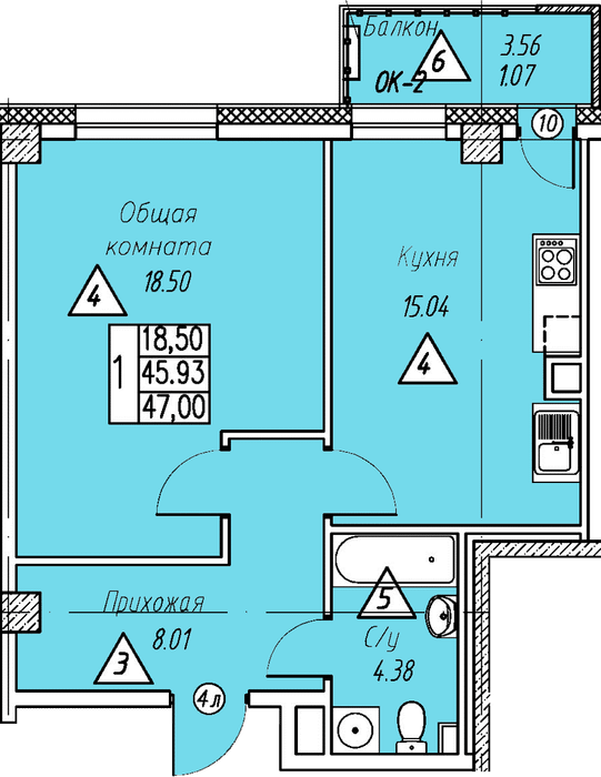 1-комн. 47,00 м² ・ № 4 ・ этаж 1/7 ・ ЖК Парк Победы, д. 1, этап 1