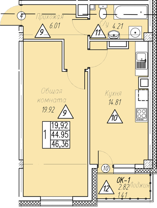 1-комн. 46,36 м² ・ № 77 ・ этаж 3/7 ・ ЖК Парк Победы, д. 1, этап 1